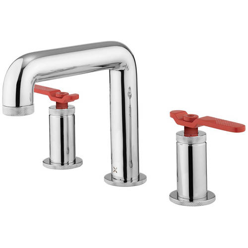 Crosswater UNION 3 hole deck mounted basin mixer tap in chrome with red lever handles.