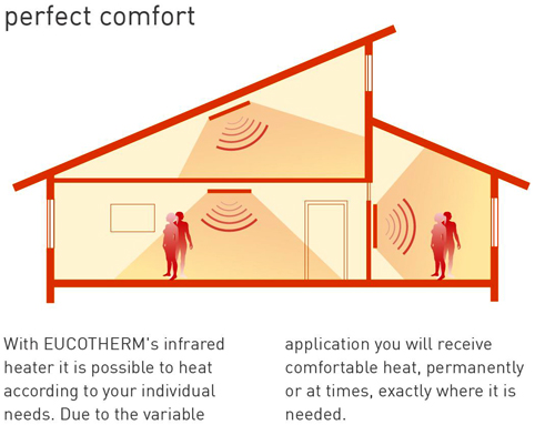 EUCOTHERM Infrared Radiators use the principle of solar radiation and provide comforting warmth to every room. This radiation does not need air to transport the heat but permeates it nearly lossless and turns into heat wherever it meets objects, walls and ceilings. These store the heat and release it evenly into the room. Thus the rooms are always warm and dry. EUCOTHERM infrared-heaters are up to 50 % cheaper than conventional heating systems.