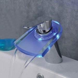 Glass waterfall basin tap in chrome with temperature sensitive LED lights and lever handle.