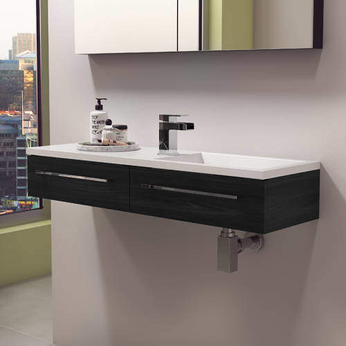 Dias wall mounted bathroom vanity unit in black ash finish with drawer and white basin.
