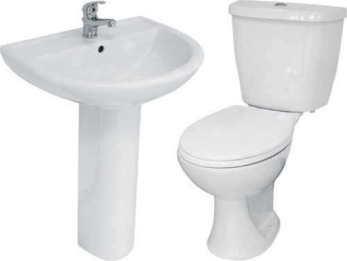 4 Piece bathroom suite with toilet, cistern, fittings, seat, 1 tap hole basin and pedestal.