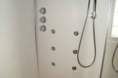 Square steam shower enclosure in chrome with white glass (900x900mm).