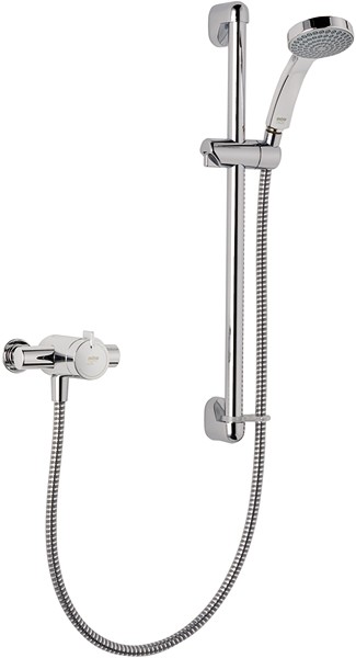 Exposed thermostatic shower valve with slide rail, shower handset and hose in chrome.