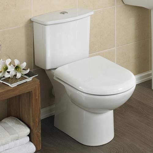Linton toilet with dual push flush cistern, fittings and seat. Size 400W x 690D x 750H mm.