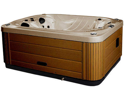 Mercury 3 person Hot Tub in oyster opal with chocolate cabinet and light yellow cover. Size: 2180x1680x940mm.