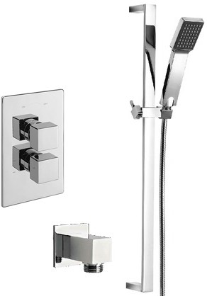 Thermostatic twin concealed shower valve in chrome with slide rail kit and wall outlet.