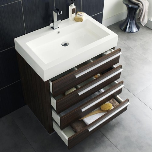 Sequence 750mm wall hung vanity unit in walnut with drawers and basin.