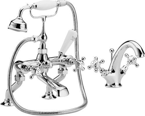 Traditional basin mixer and bath shower mixer tap set in chrome with free shower kit.