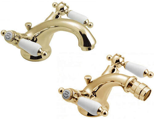 Kensington traditional mono basin and bidet mixer taps pack in antique gold and white with pop up basin wastes.